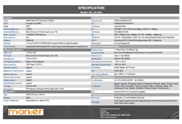 ISC-500Ultrarugged mobile handheld. The product has 4.5-inch QHD screen with 500nit, Sunlight readable, based on a MTK Helio P60 Octa-core processor and 4G communication technology, and 5000 mAh high-capacity replaceable battery. Use Android system with GMS certification and support Safeuem EDM system. ISC-500Ultrais equipped with Honeywell EX30 long-distance 1D/2D scan engine, Which can seamlessly read barcodes from 10 cm to 30 m [4 in to 99 ft]* using the latest technology for a fast auto-focus mechanism which, It can easily to collect barcodes on the top of warehouse shelves and improve staff work efficiency. The products can be applied to many application scenarios including warehousing, patrol inspection, logistics and express delivery, manufacturing, new retail of stores, asset management and so on, which can help enterprises improve their management level.